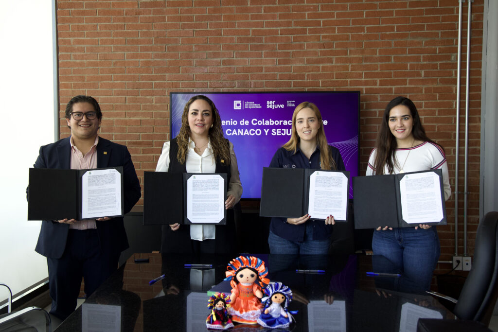Con el objetivo de elaborar proyectos, programas y acciones de interés y participación mutua en beneficio de la comunidad de jóvenes empresarios, se llevó a cabo la firma de un convenio de colaboración entre representantes de la Secretaría de la Juventud (SEJUVE) y la Cámara Nacional de Comercio (CANACO) en Querétaro.